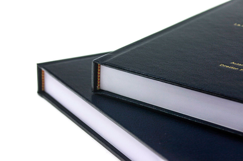 El proceso de encuadernación es un proceso artesanal, utilizando cartulina gráfica de 300 gr. forrada en geltex, guaflex o telflex. (ver catálogo de materiales y referencias). Se estampa portada y lomo según el diseño proporcionado en oro, plata o tintas mediante un sistema de presión y calor para un acabado duradero.